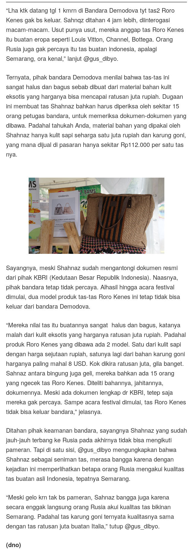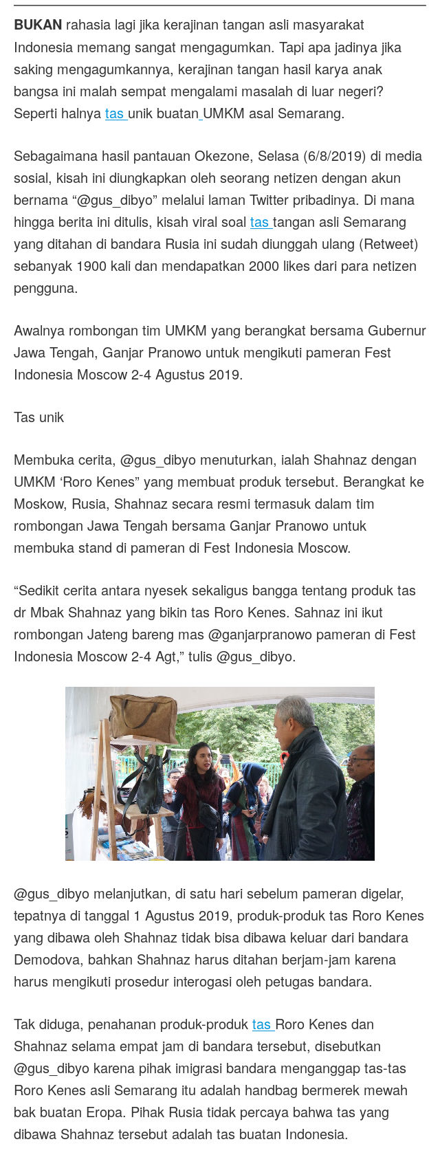 Kliping pemberitaan Rorokenes di Okezone 6 Agustus 2019 dengan judul Dianggap Terlalu Bagus, Tas UMKM Asli Semarang Ditahan Bandara Rusia. Selamat membaca.