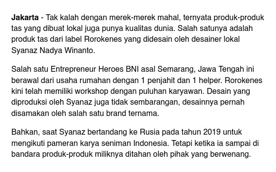 Kliping pemberitaan Rorokenes di media detikNews dengan judul Viral di Russia, Inilah kisah Founder UMKM Rorokenes pada tanggal 28 Juli 2021.