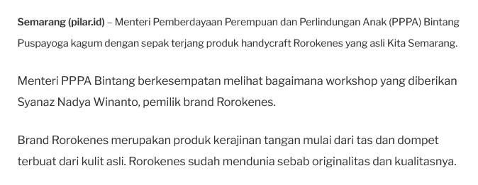 Kliping pemberitaan Rorokenes di media pilar.id dengan judul Menteri PPPA Bangga Produk Rorokenes, Ini Sejarah Godybag Karung Goni Syanaz Disejajarkan dengan Louis Vuitton, Chanel, Gucci pada tanggal 20 Februari 2023.
