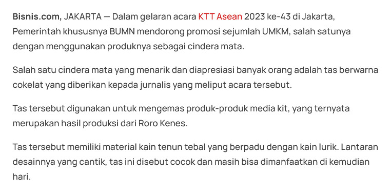 Kliping pemberitaan Rorokenes di media Bisnis.com dengan judul Sosok di Balik Rorokenes yang Jadi Souvenir Jurnalis di KTT Asean ke-43 pada tanggal 8 September 2023.