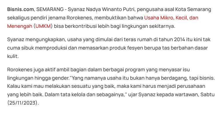 Kliping pemberitaan Rorokenes di media Bisnis.com dengan judul UMKM Punya Peran Pastikan Aspek Keberlanjutan dalam Bisnis pada tanggal 26 November 2023.