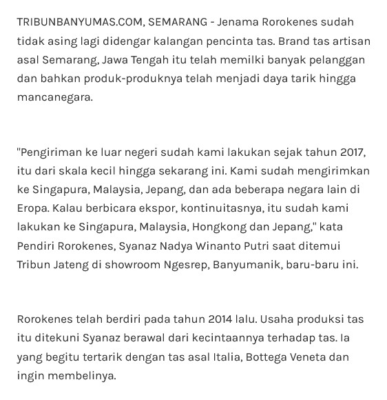 Kliping pemberitaan Rorokenes di media TRIBUNBANYUMAS.COM dengan judul Cerita Sukses Pengusaha Tas Lokal yang Mendunia di Semarang, Berawal tak Mampu Beli pada tanggal 5 Desember 2023.