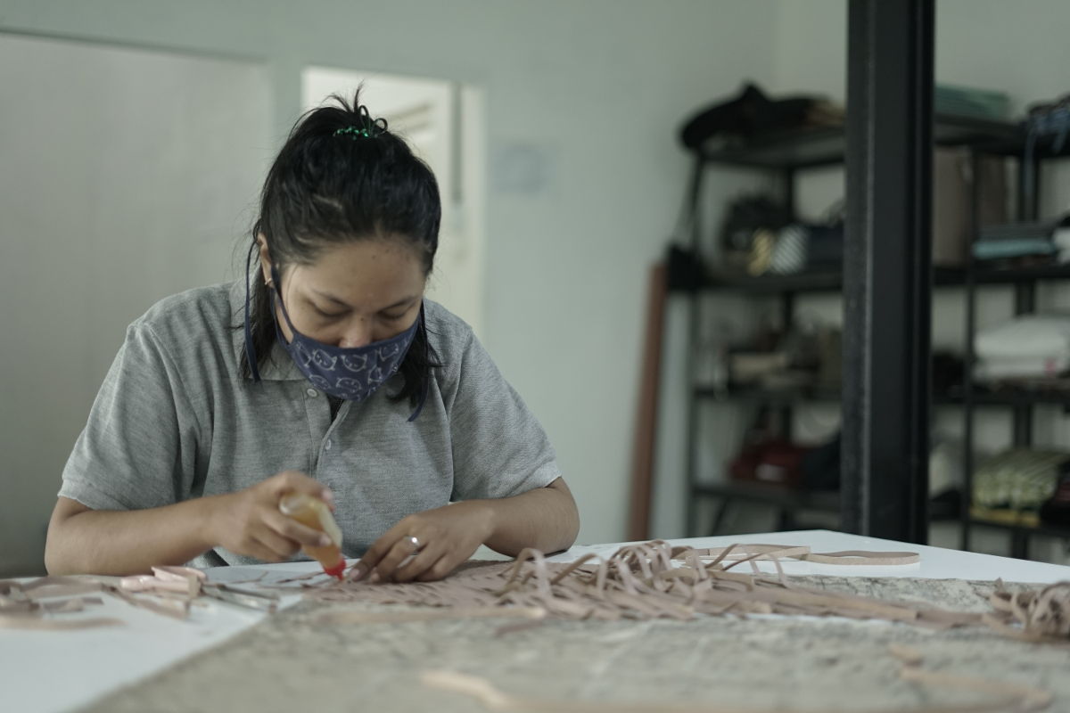 To make a Rorokenes bag, first the craftsman will draw a master pattern on the colored leather sheet. The leather sheet is marked to be cut into woven strips. Each strip is measured up to millimeters for a neat and precise cut.