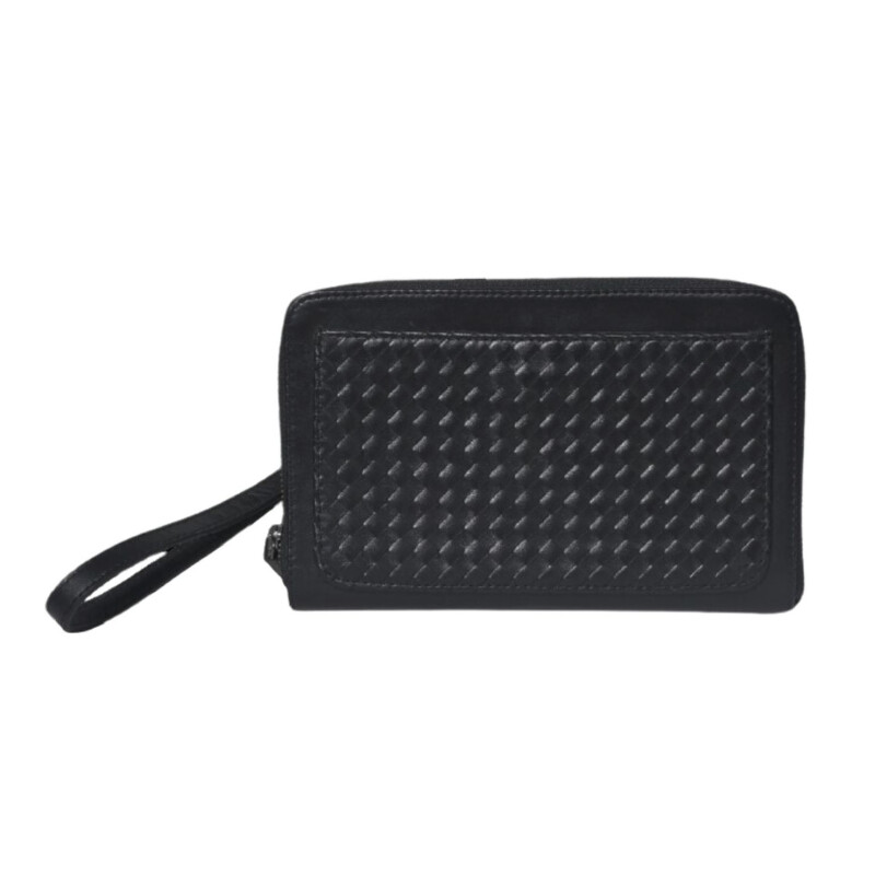 Clutch dengan anyaman kulit pada kantung depan yang disertai dengan kunci magnet. Dilengkapi slip tangan dan handel tangan lepas pasang pada bagian belakang.