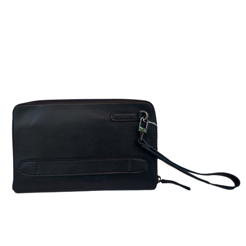 Penutup clutch dengan ritsleting.Interior dibagi menjadi dua kompartemen yang dipisahkan oleh kantong ritsleting serta dua kantung dalam, dan delapan slot kartu.