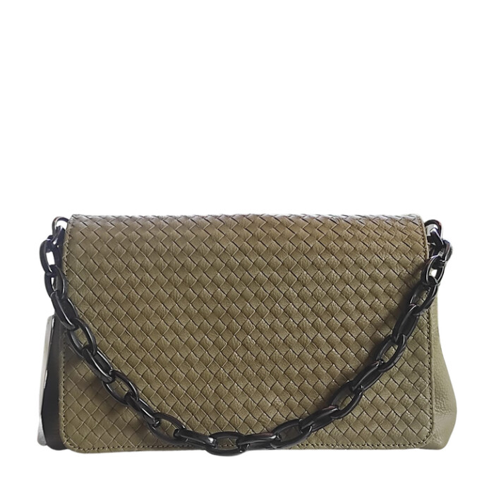 Tas dengan anyaman kulit sapi pada bagian klip yang disertai magnet sebagai pengunci. Interior dilapisi kain suede, terbagi dalam 2 kompartemen yang disekat oleh kantong ritsleting. Pada dinding interior dilengkapi kantong dalam dan kantong ritsleting.