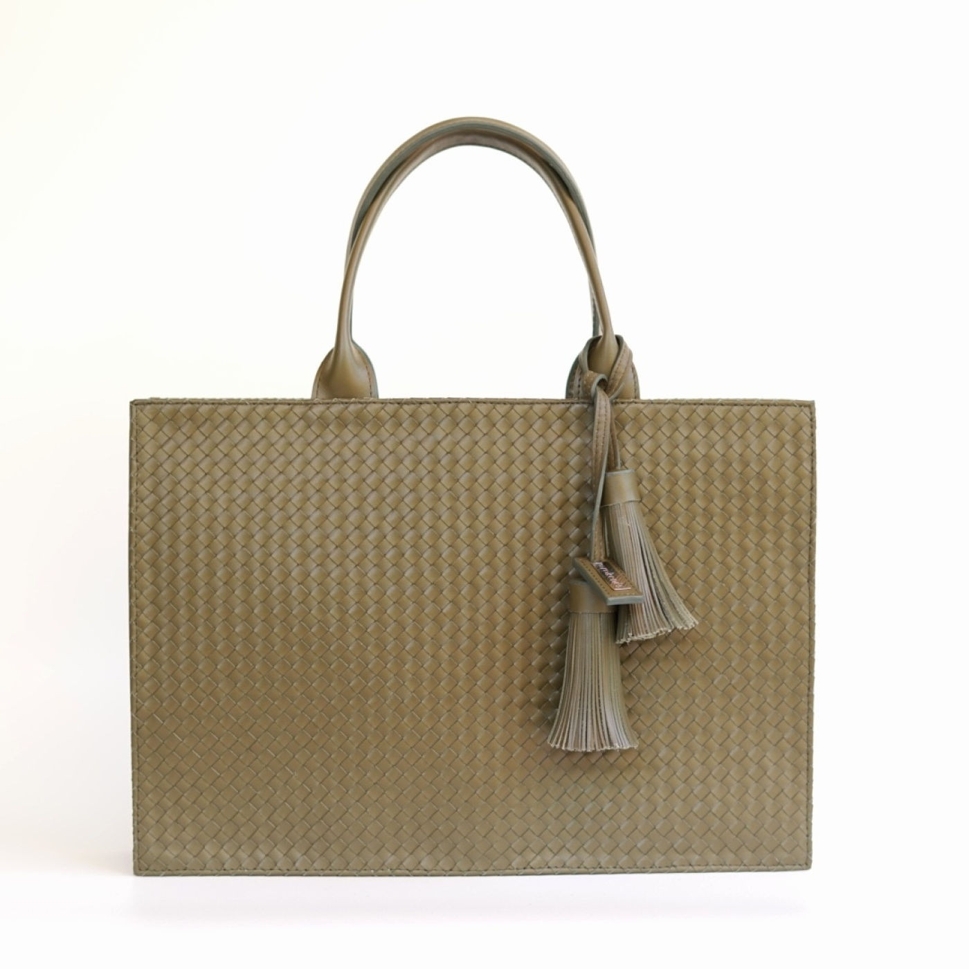 Tote bag dengan anyaman kulit pada depan dan belakang eksterior tas. Bagian dalam dilapisi kain suede dan terdapat kantung dalam dan kantung ritsleting. Cukup untuk laptop 14 inci.