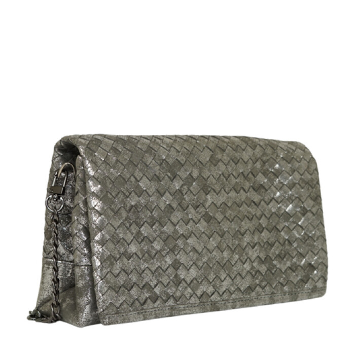 Clutch dengan anyaman kulit sapi pada eksterior dengan magnet klip sebagai pengunci. Interior dilapisi kain suede disertai kantung dalam dan kantung ritsleting Dapat digayakan sebagai tas bahu dengan tali panjang rantai lepas pasang.