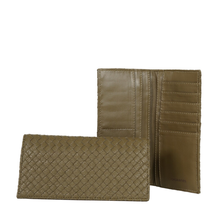 A wallet with genuine woven cowhide accents on the exterior. It features a bill pocket, a zippered coin pocket, and eight card slots.