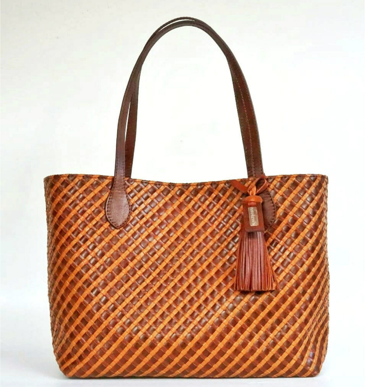 Tote bag with woven genuine leather with a vine motif on the exterior and a zipper closure. The interior is lined with suede with an open pocket and a zippered pocket. Can accommodate up to a 14-inch laptop.