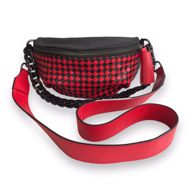 Waist bag with woven cowhide accents and zipper closure. Interior lined with suede fabric, equipped with inner pocket. Comes with a detachable long leather strap and plastic chain strap (optional) as accessories and handles.