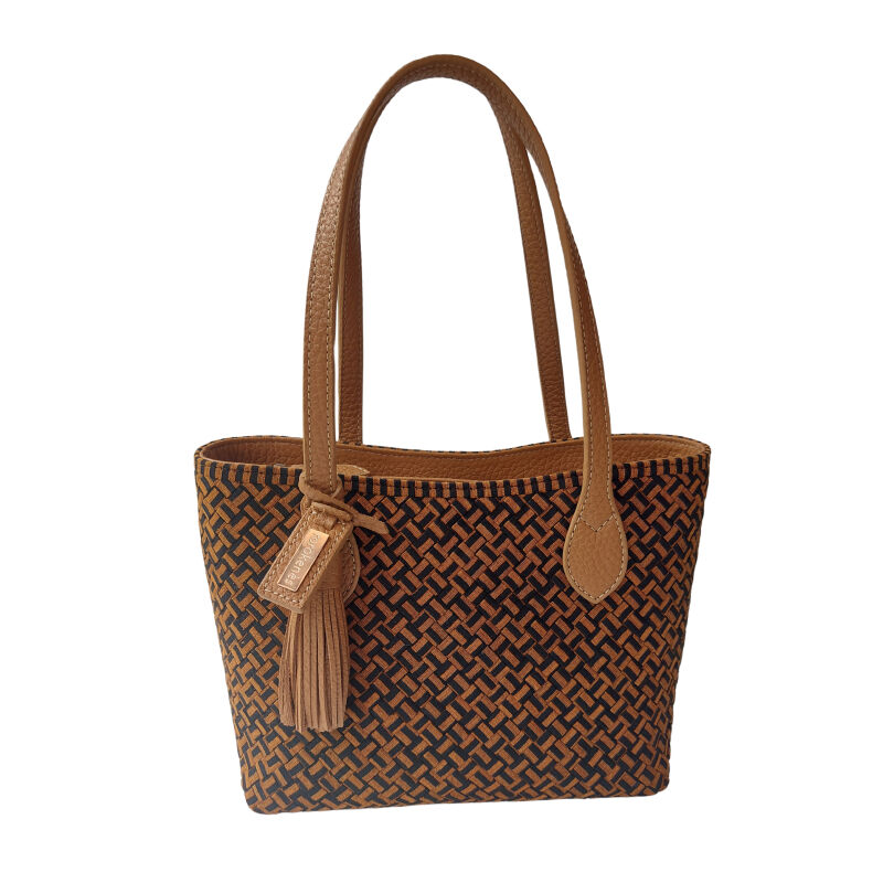 Tote bag with woven lurik fabric from a non-mechanical loom (ATBM) for the exterior of the bag and zipper closure. The interior is lined with suede fabric and features an open pocket and zippered pocket.