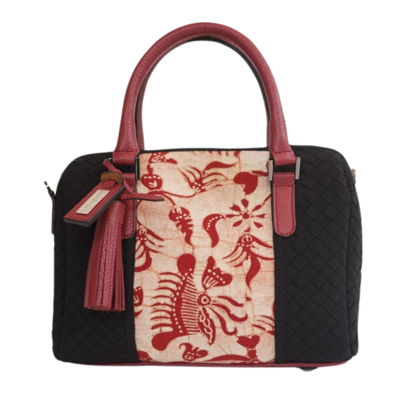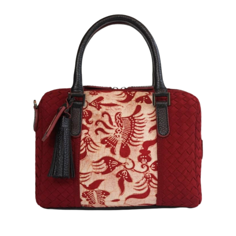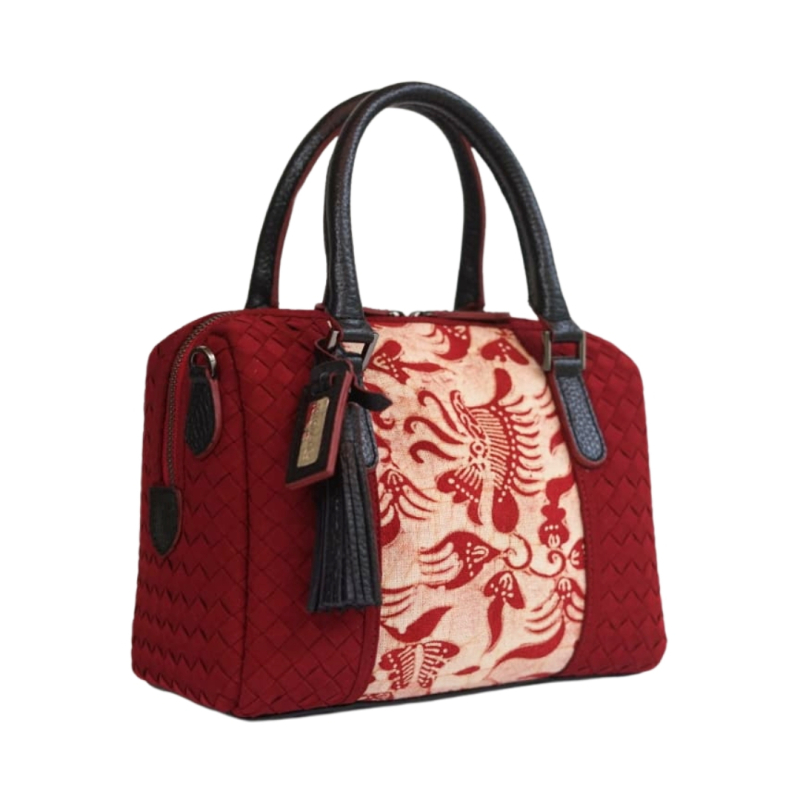 Boston bag dari anyaman kain dengan potongan batik tulis gedog pada bagian tengah. Handel dan rumbai dari kulit sapi. Interior dilapisi kain suede dan dilengkapi dengan kantung terbuka dan kantong ritsleting.