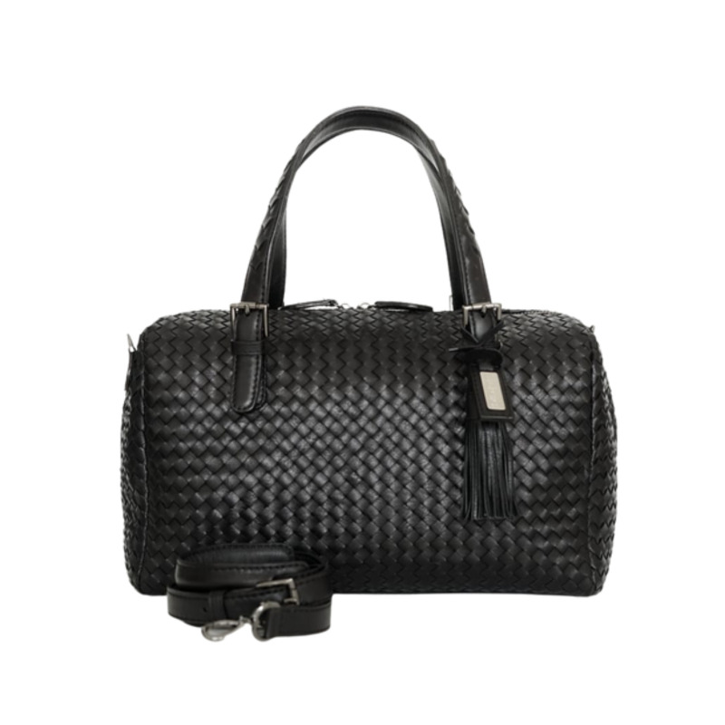 Boston bag dengan anyaman kulit sapi asli untuk eksterior dan penutup ritsleting. Interior dilapisi kain suede, dilengkapi kantong dalam dan kantong ritsleting.