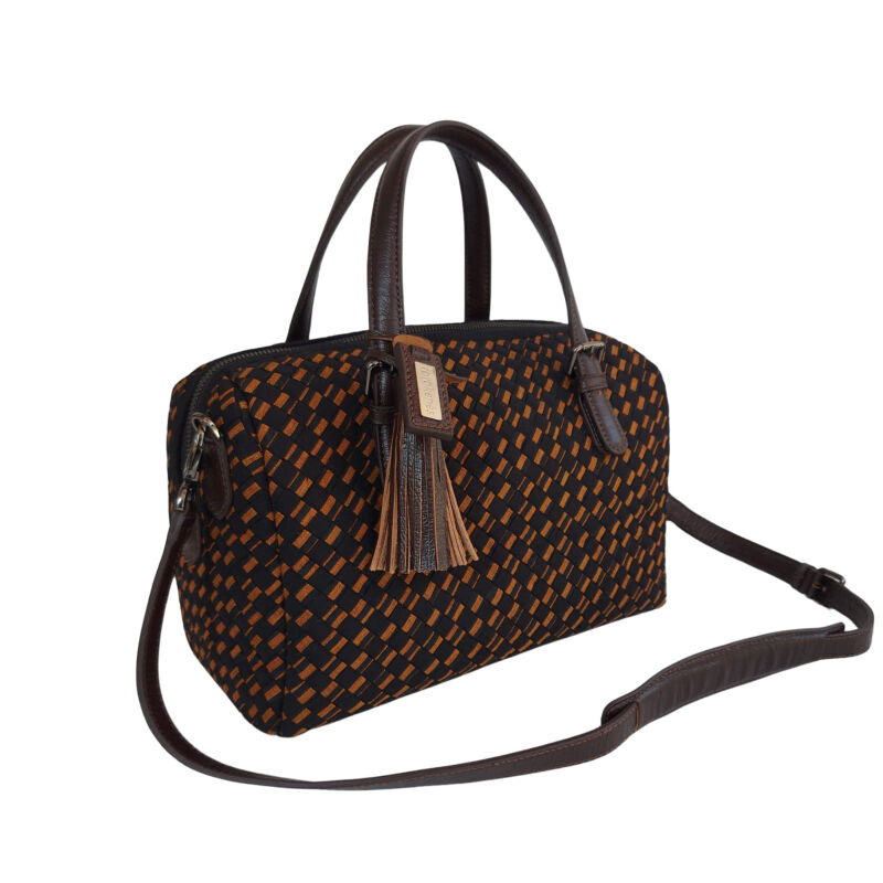 Boston bag dari anyaman tenun lurik Alat Tenun Bukan Mesin (ATBM) diPadukan dengan handel dan rumbai kulit sapi.Interior dilapisi kain suede, dilengkapi kantong dalam dan kantong ritsleting. Handel dapat disesuaikan panjangnya. Dapat digayakan sebagai tas bahu dengan tali kulit panjang yang dapat dilepas pasang dan disesuaikan panjangnya.