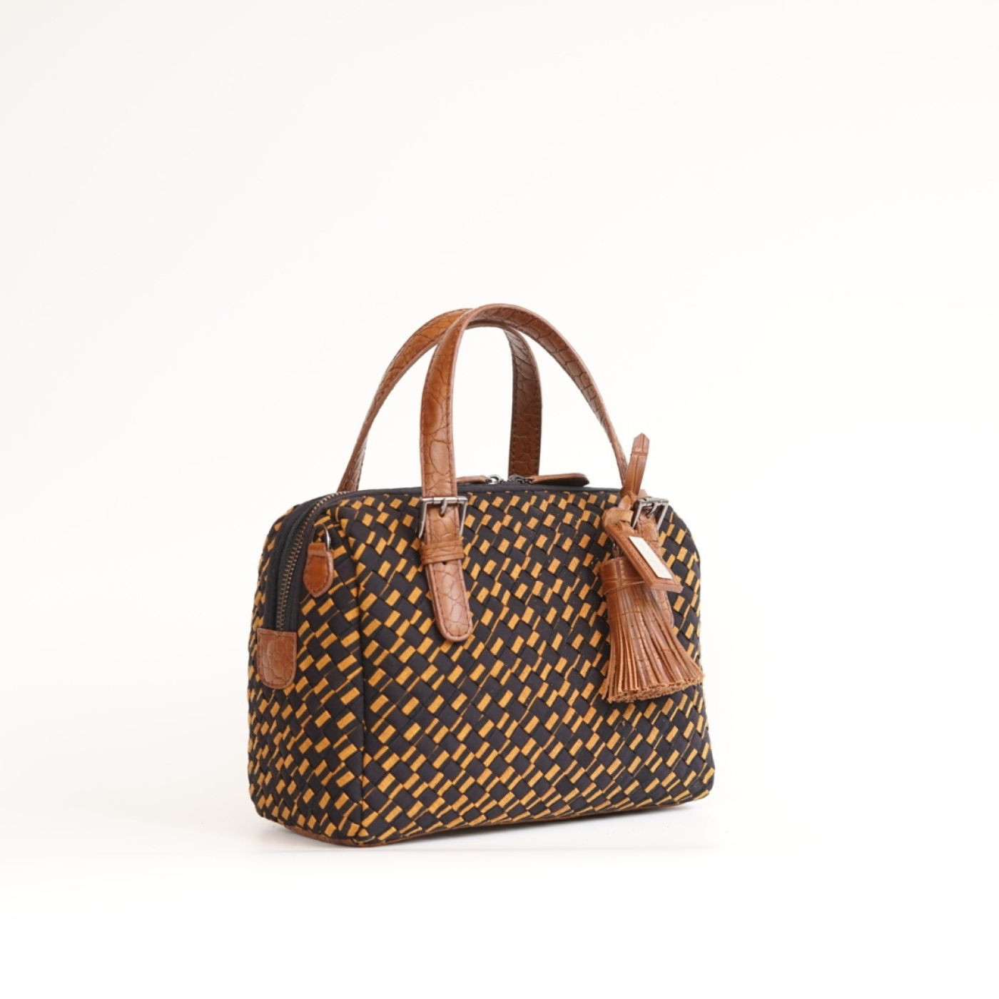 Boston bag dari anyaman tenun lurik Alat Tenun Bukan Mesin (ATBM) diPadukan dengan handel dan rumbai kulit sapi.Interior dilapisi kain suede, dilengkapi kantung dalam dan kantong ritsleting. Handel dapat disesuaikan panjangnya. Dapat digayakan sebagai tas bahu dengan tali kulit panjang yang dapat dilepas pasang dan disesuaikan panjangnya.