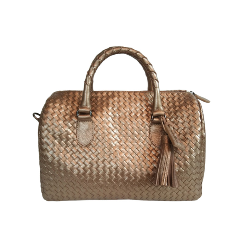 Boston bag with genuine cowhide leather weave for the exterior and zipper closure. The interior is lined with suede fabric and features an inner pocket and zipper pocket.