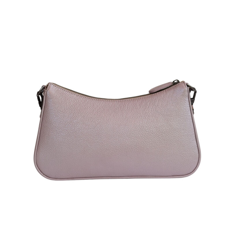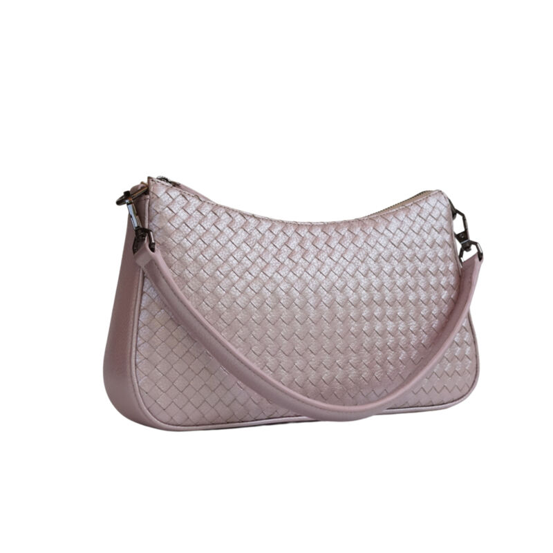 Tas mini dengan anyaman kulit sapi pada bagian depan. Interior dilapisi kain suede, lengkap dengan dua kantong terbuka dan kantong ritsleting. Dapat digayakan sebagai tas jinjing atau bahu dengan tali kulit pendek lepas pasang.