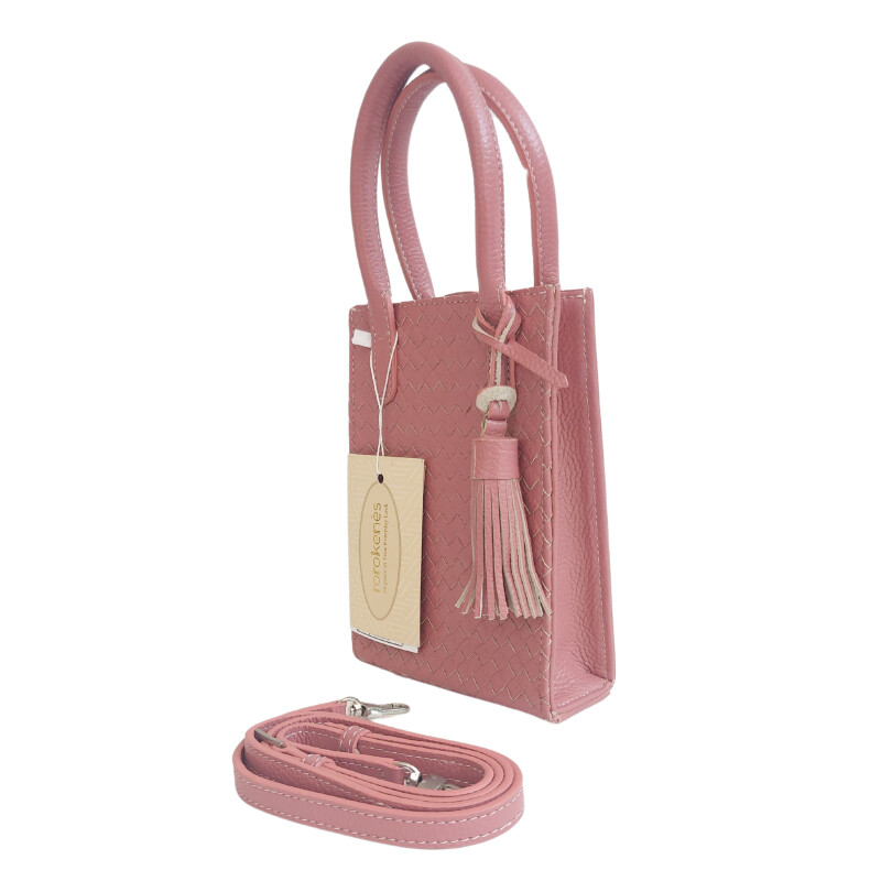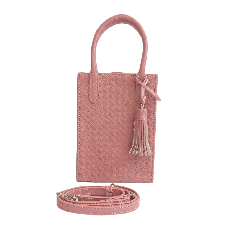 Tas ponsel dengan anyaman kulit untuk eksterior dengan klip magnet sebagai pengunci. Disertai tali kulit panjang lepas pasang yang dapat disesuaikan ukurannya.