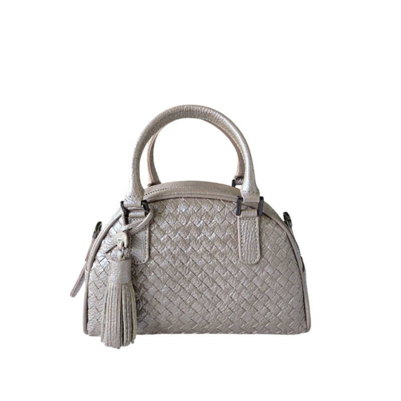 Handbag mini dengan anyaman kulit sapi asli pada bagian depan dan belakang dengan ritsleting sebagai penutup. Interior dilapisi kain suede, lengkap dengan kantung terbuka dan kantong ritsleting. Bisa digayakan sebagai tas bahu atau selempang dengan tali kulit panjang lepas pasang yang dapat disesuaikan ukurannya.