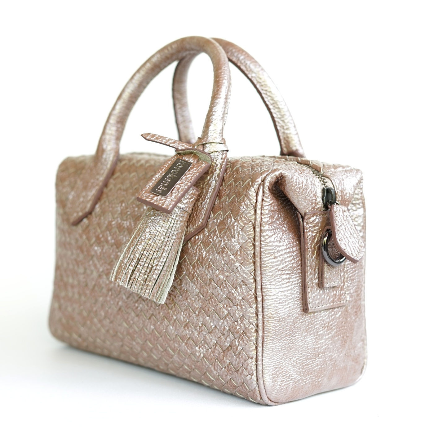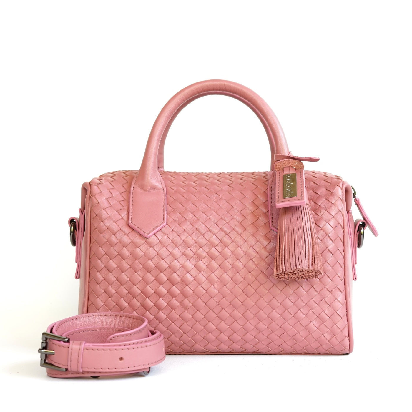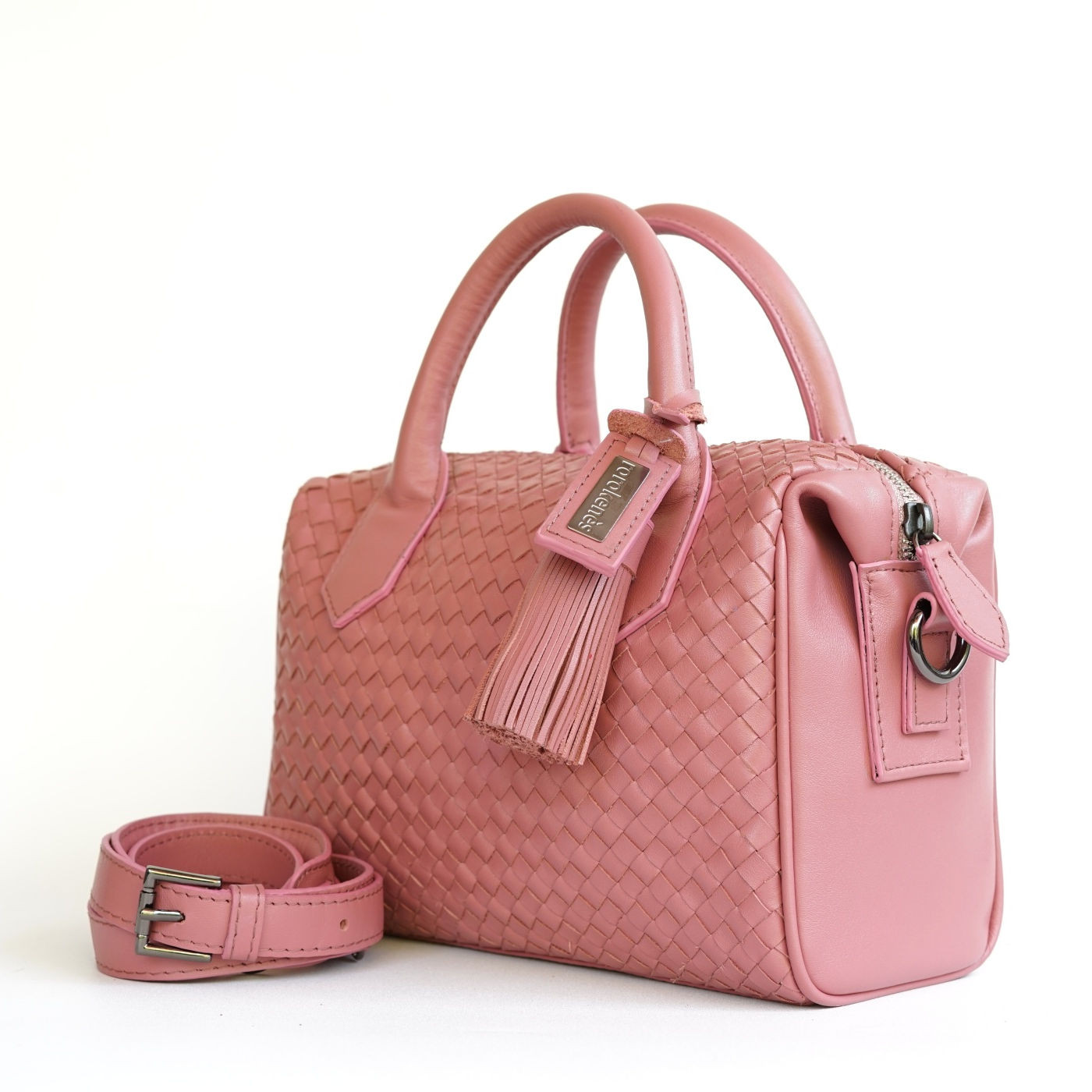 Handbag with woven cowhide leather and zipper closure. Interior lined with suede fabric, complete with an open pocket and one zippered pocket. Can be styled as a shoulder bag or crossbody bag with a long, detachable leather strap that can be adjusted in size.