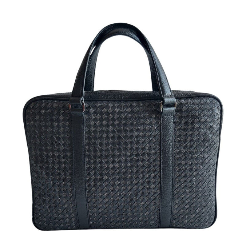 Tas laptop dengan anyaman kulit sapi di kedua sisi. Interior dilapisi poliester, dilengkapi kantong dalam, kantong ritsleting, dan kantung laptop yang mampu memuat hingga laptop 14 inci.